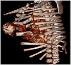 The neonate presented no signs of respiratory distress nor systemic failure. Plain radiograms shows the calcificated mass concerning to the 5th,6th, 7th ribs and the sternum with deterioration of the chest cavity Figures 2a&2b. Ultrasound of the area revealed a heterogeneous lesion, which casted significant acoustic shadow and was located symmetrically to the arches of the 6th, 7thand 8th left ribs. Multislice, low-dose CT scan was subsequently performed to clarify the origin, the extension and the configuration of the mass; 3D reconstructions were particularly helpful as they provided volumetric Figures suitable for preoperative planning Figures 3a&3b.