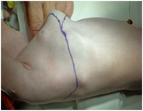 Our young patient was a term female neonate, of 3150g birth weight, born with cesarean section due to history of fibroidectomy 2years ago. A round solid mass of 3-3,5cm diameter was detected antenatally with fetal ultrasound scan, adjacent to the lower third of the body of the sternum in keeping with lipoma. Post-partum clinical examination indicated a solid mass, of 3cm X 4cm X 5,5cm approximately, located in the inferior left parasternal area affecting the 7th and 8th costosternal synchondrosis Figure 1.