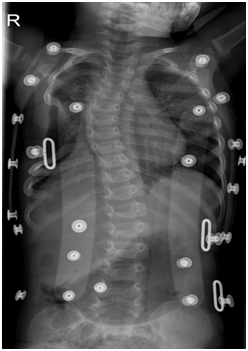 Scoliosis of the thoracic vertebral column seems to be an inevitable late complication16. The grade of scoliosis and the decision to cure it, depends on the extension of the lesion and the number of the ribs affected. Scoliosis may present in young patients after just a plain thoracotomy for various interventions such as esophageal atresia repair, lobectomy or sequestration excision. Is obvious that the ablation of ribs and therefore the bereavement of the static support of the vertebral column leads to a grade of scoliosis. Confrontation depends on the grade of columnar deviation, the age and the provoked clinical problems.17,18 Orthopedic surgeons, neurologists and pneumonologists must collaborate to decide the need of surgical repair.