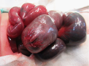 A one day male was admitted with frothing and respiratory distress and absent anal opening. The patient was a full term normal delivery with a birth weight of 2.2kg and cried immediately after birth. Antenatal history was not significant.2 On examination, the patient had an imperforate anus with poorly developed buttocks. A red rubber catheter could be passed orally only up to 8 cm from the alveolar margin. Radiographic studies confirmed the findings of EA with TEF (Figure 1). Cross table prone X ray was indicative of high ARM (Figure 2). Routine laboratories were within normal limits. TEF repair was done via right thoracotomy extrapleural approach. On laparotomy for colostomy, the colon was absent with the small bowel was completely developed up to the ileocaecal junction, and a blind ending caecum with appendix was present (Figure 3). There was no dilatation of the proximal ileum and there was no enterovesical fistula. End caecostomy was performed however the patient succumbed to sepsis on postoperative day 3.3-5