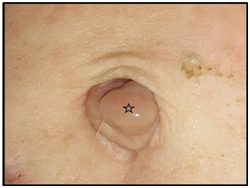 Figure 1 An umbilical granuloma. Characteristically, it is a small, pale pink-colored and moist mass (*) placing within the umbilical ring.