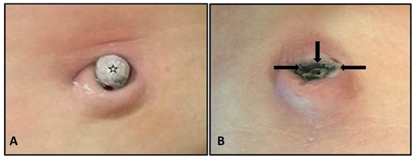Conventional treatment of umbilical granulomas with silver nitrate is a worldwide practice. Although antiseptic effects of silver nitrate are remarkable, it has astringent/caustic effects as well. These effects are responsible for its therapeutic role, but adjacent healthy tissues may be damaged if silver nitrate is contacted. Especially, pencil like preparates consisting of %100 silver nitrate (100%) should be touched the lesion with a great caution. Otherwise it can cause chemical burn in surrounding skin (Figure 2).24 Therefore, sticks or Q tip applicators consisting of 75% silver nitrate and 25% potassium nitrate (HemoStop™, Bray™, Grafco™, etc.) should be preferred for chemical cauterization. Before silver nitrate application, umbilical area should be cleaned with an antiseptic solution and dried with a sterile sponge.17 Surrounding skin may be protected by petroleum jelly (Vaseline™).6 Care should be taken touching the applicator just on the granulation tissue. If the granuloma persists after 3 or 4 applications which are performed an interval of 3-4days, other potential diseases or alternative treatments should be considered.22 It should be kept in mind that umbilical polyps do not respond to silver nitrate application.