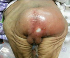 A child with cloaca was operated for transverse loop colostomy on day 1 of life and presented with acute obstruction at 1 month-jejunal resection and anastomosis was done for jejunal gangrene. There was no evidence of hydrocolpos. She presented at 5 months with complaints of stomal diarrhea, failure to thrive and a bulge through the perineum (Figure 1). On examination, her general condition was poor with weight 2.6kg, pallor, sunken anterior fontanelle, dry and wrinkled skin; abdominal distention with sunken stoma but there was no guarding and bowel sounds were present. There was a bulge in the perineum with positive cry impulse in the right gluteal region from which seropurulent fluid was aspirated (Figured 2&3).