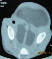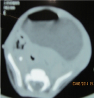 Figure 2 CT Scan: A large cystic structure with air-fluid level with complex morphology in the abdomen & pelvis.