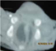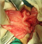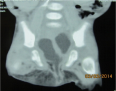 Investigations revealed anaemia, leucocytosis, deranged electrolytes and metabolic acidosis. USG was suggestive of a suspicious obturator hernia on right side. CT scan was suggestive of bulging of a large complex cystic structure with air-fluid level on the right side. Sagittal reformations also suggested the inferior descent of the cystic structure through the perineal floor (Figures 4 &5). The deranged laboratory parameters were corrected and the child was taken for emergency exploration. Intra-operatively, it was found that the massive hydrocolpos was protruding through the perineum as the bulge. There was no perineal or obturator defect. Drainage of the massive hydrocolpos was done by an abdominal vaginostomy (Figures 6&7).