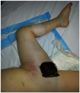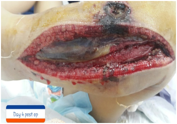 Upon admission, her left leg was cyanotic, pulseless, cold and edematous, with decreased motility. The cyanosis reached up to the upper chest. The girl became hypotensive and pale so an urgent fasciotomy was done (Figure 1). Broad-spectrum antibiotics and anticoagulant were started. The patient received post op blood transfusion for a hemoglobin of 6.1 and platelet transfusion for a count of 17 000. DIC panel was normal. She also received human albumin since she was kept NPO for several days since she was in pain from her abdominal bruises and due to her wound. Daily dressing changes were done. Debridement was performed twice in the OR. The patient was discharged home when her wound improved after one month of daily dressings.