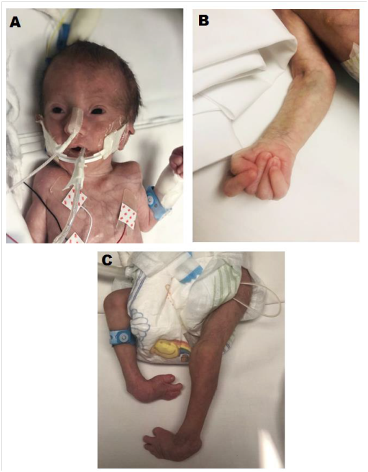A day 8 of life baby boy was referred to our university hospital for management of respiratory distress. He was born at 39 weeks gestational age by normal vaginal delivery to non-consanguineous, healthy, Gravida 6 Aborta 1 Para 5, 35 year old mother and 38 year old father. Spontaneous abortion occurred during the first pregnancy at 12 weeks of gestation for unknown reasons. The living children are all healthy. The pregnancy was uneventful except for left hydronephrosis and intrauterine growth restriction diagnosed prenatally. Baby was born with an Apgar score 2 and 4 at 1minute and 5minutes respectively, requiring resuscitation and placed on mechanical ventilation. Birth weight was 1800grams (<3rd percentile), birth length 40cm (<3rd percentile), head circumference 29cm (<3rd percentile). Baby remained intubated for 8 days in the peripheral hospital, with failure of weaning from mechanical ventilation which was attributed to a cardiac etiology. Patient was then transferred to our university hospital for further workup and management. Physical examination revealed typical characteristics of trisomy 18: strawberry shaped head, protruding occiput, depressed nasal bridge, high-arched palate, microretrognathism, low set ears (Figure 1A), short neck, wide-spaced nipples, clinodactyly of the 5th fingers, clenched fist (Figure 1B), rocker-bottom feet (Figure 1C) and grade IV pansystolic murmur with thrill. He had descended testes bilaterally with normal size phallus. Neurological exam revealed a hypotonic baby with normal reflexes. Echocardiography revealed the presence of VSD (6mm) with left to right shunt, with a PDA of 2.5mm, dilated left atrium and pulmonary hypertension of 45mmHg. Ultrasound of the brain showed no abnormalities. Ultrasound of the kidneys showed left kidney hydronephrosis with a renal pelvis of 8.7mm and dilation of the calyceal system. There was also a left megaureter measuring 12 mm in diameter. The right kidney was well differentiated and normal in size. Complete blood count, electrolytes, metabolic screening and blood glucose were all normal. Chromosomal analysis of a peripheral blood sample using Giemsa trypsin (GTG banding) showed the karyotype of 48, XXY, +18 (Figure 2). Genetic counselling was offered to the parents. Baby is currently 1 month old, still on non-invasive mechanical ventilation and feeding by nasogastric tube with failure to gain weight.