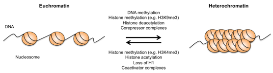 Eukaryotic DNA is packaged into a macromolecular structure called chromatin by wrapping 147 base pairs of naked DNA around the histone octamer containing two copies of each core histone H2A, H2B, H3 and H4.1 With the addition of linker histone H1 that binds to the nucleosome at the DNA entry-exit point, protecting the DNA linking adjacent nucleosomes, further compaction and condensation is achieved.2 In order to facilitate cellular functions such as replication, transcription and DNA repair, the compaction of DNA is carried out in a way that gives rise to two structurally and functionally distinct chromosomal domains; namely euchromatin, representing the transcriptionally active, loosely packaged and gene-rich regions and the highly condensed and gene-poor heterochromatin.3 The transition between euchromatin and heterochromatin is largely influenced by mechanisms involving DNA methylation, non-coding RNAs and RNA interference (RNAi), DNA replication-independent incorporation of histone variants and histone post-translational modifications (Figure 1).