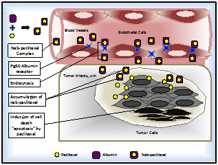 On the other hand, nab-paclitaxel molecular mechanism is dependent on increased transport of paclitaxel to the tumor by albumin specifically binding to gp60 and facilitating caveolin-mediated transcytosis to enhance delivery across the blood vessels endothelial cells, thus transporting paclitaxel into extra vascular space to the tumor cells, hence inducing apoptosis, and resulting in an advantageous pharmacokinetic (PK) profile (Figure 2).25,43 Indeed, several preclinical studies reported an approximately 10-fold endothelial binding of nab-paclitaxel, and 4-fold higher levels of transocytosis through endothelial cells in contrast to the solvent based paclitaxel allowing for a dose dependent antitumor activity.43,44