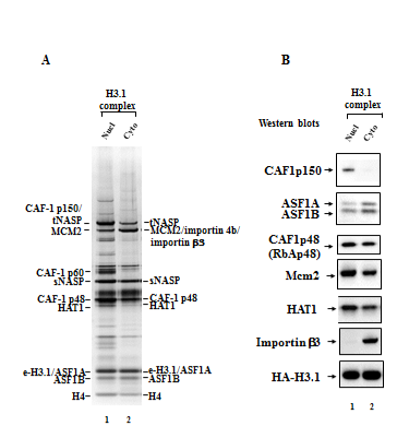 (A) Silver staining of the H3.1 nuclear (lane 1) and cytoplasmic (lane 2) predeposition complexes obtained by tandem affinity purification on anti-Flag and anti-HA antibodies coupled agarose beads from the extracts of transduced HeLa cells. The proteins identified by mass spectrometric analysis are indicated. (B) Immunoblot analysis of the H3.1 nuclear (lane 1) and cytoplasmic (lane 2) predeposition complexes. Complexes were analyzed by immunoblotting with anti-CAF1p150, anti-ASF1A/B, anti-CAF1p48 (RbAp48), anti-Mcm2, anti-HAT1, anti-importin beta 3, anti-HA antibodies. The latter antibody was used to reveal the epitope-tagged histone H3.1.