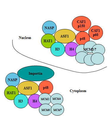 According to this model the core complex is formed in the cytoplasm that contains the dimer of histones H3/H4, the histone chaperone ASF1A/B, the histone acetyltransferase HAT1, the small subunit of histone chaperone CAF-1 p48, MCM complex involved in the replication of DNA and importin-beta 3. With the help of the importin-beta 3 the core complex is transported into the nucleus through the nuclear pores, loses the importin-beta 3 on the inner side of the nuclear pore and acquires the additional subunits of histone chaperone CAF-1 (p150 and p60) forming the complete histone H3.1 predeposition complex that assembles the nucleosome on the replicating DNA.