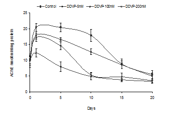 In untreated worms, the AChE activity increased up to 5d and then decreased after 10d. A similar trend was also evident in worms exposed to dichlorvos concentration (5, 100nM). However in worms exposed to 200nM dichlorvos, the AChE activity decreased after 5d. As evident from (Figure 2), varying degrees of inhibition in the enzyme activity was evident from 1d in worms exposed to dichlorvos. The inhibition due to exposure to dichlorvos ranged between 12-40% (1d) 18-16% (5d), 29-73% (10d). Maximum inhibition of AChE activity was evident on day 10.