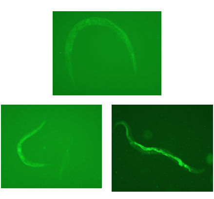 Fluorescence microscopy: On 15d after exposure, worms were immobilized by adding a drop of sodium azide (0.1%) and placed them on slide with cover slip and then observed under phase contrast microscope with a fluorescence module for the localization of lipofuscin under GFP filter and photographed under 10X microscope.6