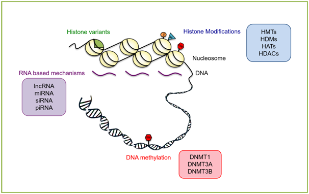 Figure 1 Selected epigenetic regulation mechanisms that modulate chromatin dynamics during stem cell differentiation. Histone modifications set by histone methyltransferases (HMTs) and histone acetylases (HATs) and removed by histone demethylases (HDMs) and histone deacetylases (HDACs), incorporation of certain histone variants, RNA based mechanisms and DNA methylationare key players in setting lineage-specific gene expression profiles. See text for more detail.