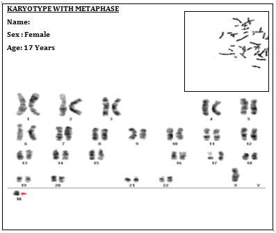 A 17 year’s old unmarried female presented in gynecology out-patient department with complaints of not having attained menarche. There was no family history of congenital urogenital disorders. On examination, she was a hirsute female, with no secondary sexual characters. She had clitoromegaly with well developed labia major. Her ultrasound revealed absent uterus and ovaries. Her renal function tests were normal and her hormonal profile revealed normal estrogen, progesterone, luteinizing hormone and follicle-stimulating hormone values. Chromosome analysis of the patient revealed 46X+ marker karyo type. Further molecular analysis is suggested for confirmation of marker chromosome (Figure 1).5-10