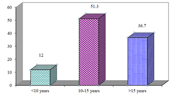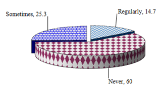 Majority of the respondents (51.3%) were in the age group between 10-15 years 12% of the street children’s age were below 10 years and rest of the street children were that is 36.7% had 15 years or above (Figure 1). Out of 150 street children majority (66.7%) were male and 33.3% were female (Figure 2). Over half of the street children that is 54% were illiterate, followed by 19.3%were received non-formal education and rest of the children that is 26.7% were received formal education. Majority that is 94.7% of the street children were Muslim and 5.3% children were Hindu (Table 1). Majority that is 126(84%) of the street children’s mother were alive while 83(55.3%) fathers were alive. On the other hand 16% that is 24 mothers & 44.7% that is 67 fathers were dead. About 16.6% of the street children had 1-2 siblings, 41.4% had 3-4 siblings, and 29.4% had 5-6 and rest of the children that is 12.6% had 7-8 siblings. Twenty percent (20%) of the street children were beggar, 36.7% were shopkeeper, 19.3% were day laborer and 24.7% were involved in other odd jobs. 25% of the street children told that gap was due to their parents died, 41.7% informed that they lived in countryside, 8.3% told that due to disliked by the parents they had no relationship with them, another 8.3% told that they dislike their parents so they are away from their parents. Some 16.7% did not mention any specific reasons of not maintaining relationship with their parents (Table 1). Table 2 shows that about 17% of the street children used to sleep 4-5 hours, while 65.3% like to sleep 6-7 hours and only 18% of the street children used to sleep 8-9 hours at night. Over two-third of the street children that is 64.7% wash clothes and have bath at footpath tube well, 20% use lake water, 41.3% of the children use hotel tube-well water and 19.3% other source of water .approximately 39% of the street children informed that they use water rarely. About 8.7% of the street children’s drinking water source was tube well water, 63.3% from supply water from foot path, 73.3% of the children consume water from hotel and 10.7% from different sources. Use of toilet by the street children majority that is 84% informed that they used to public toilet and 76% performed open air defecation. Only 2.7% of the street children had a history of taking drugs regularly, 16.7% were sometimes and rest of the 80.7% never taken any drug. Around 14.7% of the street children used to smoke regularly and 25.3% were occasionally (Figure 3).