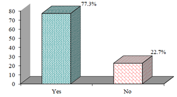 Table 3 shows that 47.0% of the street children suffered from RTI, 59.8% from fever, 50.7% suffered dysentery, 24.2% had skin problems, 27.3% of the street children had different types of accident and rest 21.2% suffered other different types of health problems. Around 77.3% of the street children received treatment for illness and 22.7% were not taken any treatment (Figure 4). Table 4 shows that 54.4% of the street children were fully cured, 40.4% were partially cured and rest 5.4% of the street children were not cured at all and 68.1%of the street children received treatment from medicine shop, 12.9% from faith-healer, 33.6% from homeopathy, 11.2% from kabiraj, 28.4% from hospital, 8.6% from MBBS doctor, 3.4% private clinic and rest of the 4.3% of the children from others sources.