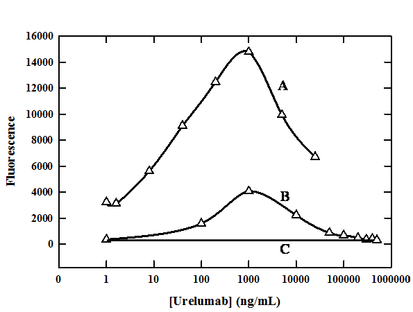 This complex formation would increase until urelumab is in sufficient stoichiometric excess to sCD137 that it is rendered functionally monovalent (antibody excess) and could no longer serve as a bridge between the excess sCD137 and the capture antibody. On either side of the maximum signal peak, only direct binding of sCD137 to the capture is thus possible. In contrast, under the peak, the sCD137 could be captured either directly or by the urelumab-sCD137 dimer complex. Since the capture, detection, and urelumab antibodies all have non-overlapping binding sites, the urelumab binding to sCD137 is not competitive to the detector antibody. Thus, in our experiments this network of HOC could cause an increased nonlinear binding of biotinylated detection reagent, leading to a higher fluorescence signal as observed in figures 3 and 4. This proposed hypothesis of formation of the network of HOC leading to positive interference in sCD137 assay is well supported qualitatively by the results of two independent light scattering methods - DLS and SEC/MALS - by demonstrating increased size and mass of the complex in the presence of urelumab.