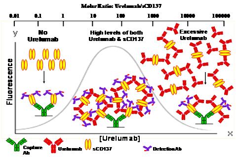 During assay development for quantitation of sCD137 a positive interference was observed in the presence of urelumab. Urelumab is a fully human IgG4 anti-sCD137 monoclonal antibody developed for the treatment of cancer and solid tumors. It activates CD137 by specifically binding to it, leading to stimulation of CD137 expressing immune cells to deliver signals that promote effector functions of anti-tumor cytotoxic T lymphocytes.9 In this study the specific positive interference by the drug urelumab in the sCD137 biomarker quantitation is investigated to understand the underlying interference mechanism.