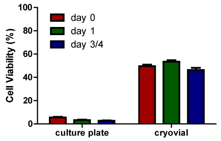 Vitrification and freezing in cryopreservation are not mutually exclusive processes, the crystalline ice phase and vitreous phase often coexist within a system. Many cells in research and some cell therapy products, such as bone marrow, are simply cryopreserved after addition of cryoprotectants to cells in suspension in cryovials or bags by slow rate cooling, with or without induced nucleation, and storage at -80°C or below -135°C. When cells are cryopreserved in suspension using such freezing methods the cells become vitrified in channels sandwiched between regions of ice. This occurs because during freezing the concentration of solutes in the unfrozen phase increases progressively until the point is reached when the residual solution is sufficiently concentrated to vitrify. Conventional freezing cryopreservation techniques are optimized by designing protocols that avoid intracellular freezing. The cell contents vitrify due to the combined processes of dehydration, cooling and the promotion of vitrification by cell permeating cryoprotectants and intracellular macromolecules. So technically, the cells are vitrified even though the method is a freezing method. In contrast when cells that survive freezing in suspension are placed on a substrate and cryopreserved using the same simple freezing methods often very low cell viability post-rewarming occurs (Figure 2). This is likely due to the cells being immobilized on a substrate so that they cannot move away from forming ice crystals. Further optimization of the freezing method is required to maximize cell viability and attachment. Similarly suspended chondrocytes are easy to cryopreserve using freezing strategies but not when embedded in their natural tissue matrices.