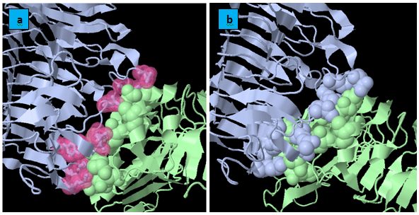 KFC Server: It is based on a machine learning approach for the prediction of binding hot spots, or the subset of residues that account for most of a protein interface’s binding free energy. The KFC Server characterizes the local structural environment, compares that environment to the environments of experimentally determined hot spots and predicts if the interface residue is a hot spot (Figure 5). Quantitatively, the analysis of the interacting residues of FmPG with each of the three PGIPs namely PvPGIP1,PvPGIP2 from Kidney Bean and PsPGIP1 from Pea (Table 2) show that the same residues of FmPG are bocked by PvPGIP2 and PsPGIP1 and these residues belong to the active site as predicted by CASTp (Table 1). Therefore we infer that the fungal enzyme FmPG is being blocked by PsPGIP1 in the similar way as that by PvPGIP2.