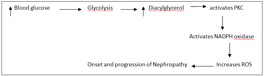 When glucose reacts with amino acids on proteins, AGE formation is initiated by forming a compound which then stimulates further chemical reactions. Elevated levels of AGE are formed under hyperglycemic conditions. Protein glycation modifies cellular function, and AGE binding to their receptors can lead to alteration in cell signaling and formation of free radicals.23 Studies have shown that AGEs which are highly specific bound to RAGE.24 Interaction between AGE-RAGE stimulates NADPH oxidase and inflammatory response. RAGE- antibody inhibits expression of cytokines induced by AGE like IL-6, MCP-1, TGF-β1, ICAM-1 and RAGE. The AGEs are finally removed from kidney. AGEs also bind to many sites at renal cells which stimulates biological effects, of which the preferential member of binding is Immunoglobulin super family.25