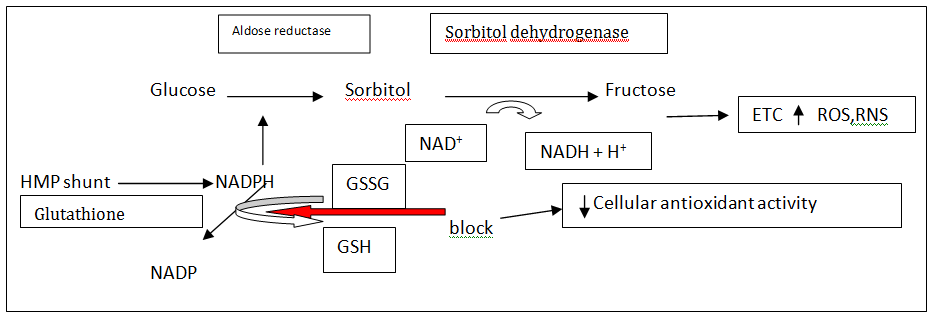 Glucose flux thorough polyol pathway leads to NADPH depletion. NADPH is an important cofactor necessary to regenerate reduced glutathione. Depletion of GSH could exacerbate intracellular oxidative stress and thereby contribute to diabetic complications.26 Inhibition of polyol pathway is a potential treatment of diabetic neuropathy.