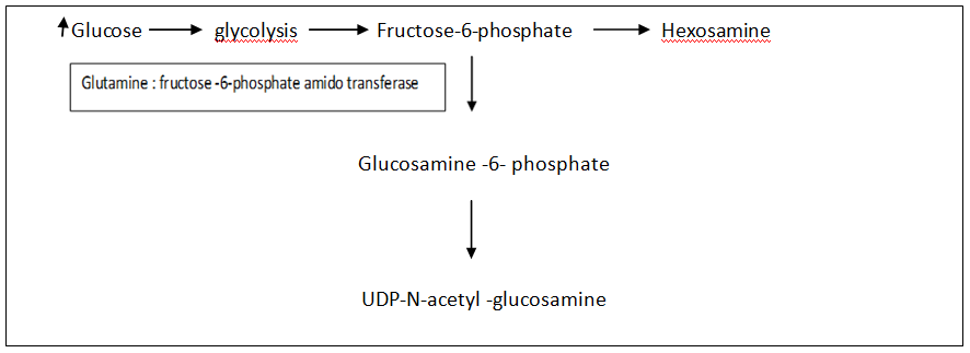 An excess glucose condition creates additional flow through the Hexosamine pathway, resulting in excess formation of GlcNAc and varied levels of gene expression.28 Vascular smooth muscle cell mitosis is promoted due to increased expression of plasminogen activator inhibitor-1, which is involved in atherosclerosis.29