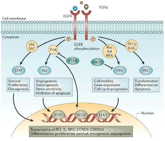 TGF-α is an intermediary in transformation of human mammary epithelial cells by an activated c-Ha-Ras gene, but not by the c-neugene. It has been demonstrated that, over expression of this growth factor was able to transform immortalized human mammary epithelial cells which also expressed a sufficient complement of functional EGF receptors (Figure 2).28,29