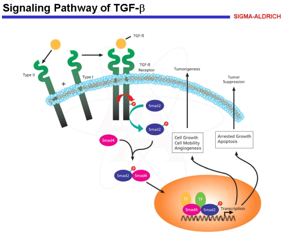 Once TGF-β becomes activated, it can bind to RII receptor which then phosphorylates type I receptor. The next step in the signal transduction pathway is the phosphorylation of downstream elements Smad 2&3 that are phosphorylated by TGF-β RI and form complexes with Smad 4. Activated Smad complexes enter the nucleus where they regulate transcription of target genes through physical interaction and functional cooperation with DNA-binding transcription factors however, Smad 6 & 7 inhibit the previous signal pathway by directly interacting with TGF-β RI and preventing Smad 2 & 3 phosphylation.38,39