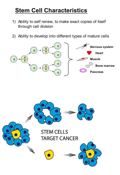 There are two defining features of stem cells first their ability to self- renewal second their ability to give rise to differentiated cell types of one or more cell lineages. Up on stem cell division, one daughter cell maintains the characteristic of a stem cell including the ability to self-renewal and the other daughter cell shows characteristics of commitment towards differentiation, the feature of self-renewal is shared with cancer cells.42