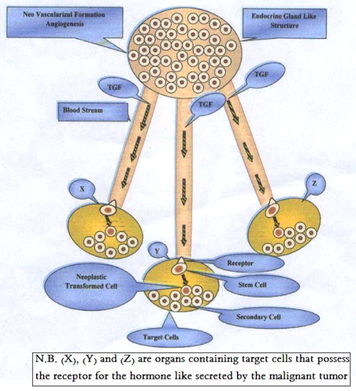 The present concept is considered to be an additional mechanism for cancer metastasis originated from the previous mentioned scientific background information. The concept is based on the idea that, the primary tumor mass is considered to be an endocrine gland like structure. Therefore, angiogenesis must occur as prerequisite for metastases. The hormones of this initiated pathogenic gland are specific growth factors mainly VEGF, TGF-α and TGF-β. The latter growth factors signaling pathways could induce tumor angiogenesis and subsequent neoplastic transformation in the stem cells localized in the different organs that possess the appropriate growth factor receptors. In another word, it is not necessary for cancer cells to migrate via blood or lymphatic vessels but, they just secrete their hormone like action; transforming growth factors into the blood stream according to endocrine system so as to exert malignant transformation in the somatic stem cells ,as a consequence of their multiple excessive exposures to these specific Biomolecules released from the primary malignant cells .The outcome of this event is a formation of secondary tumor without the necessity of migration of the primary cancer cells. This concept may explain the occurrence of secondary tumors with unknown primary, the condition could be sometimes observed by the clinical oncologist during cancer management (Figure 5).