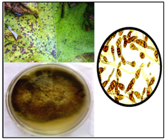 Periodical mycological visits were carried out to the selected locations. The fungal strains isolated from infected samples of Platanus orientalis kashmeriana collected from the different selected sites viz. Anantnag (04 isolates), Baramulla (03 isolates), Kupwara (05 isolates) and Srinagar (07 isolates). The Symptoms appeared on lower leaf surfaces as light dark brown irregular canker spots (like rust), later becoming deep grayish brown on the upper surface. Mostly the infected trees were prematurely defoliated. It was also observed that the extent of infection changes parabolically with the fluctuating environmental conditions in different seasons in the prevailing area (Figure 2). The fungal cultures were grown and maintained in PDA medium and for liquid culture media all fungal cultures were sub cultured in PDA kept in controlled environment growth chambers under continuous florescent light for 9-11 days at temperature of 22- 28°C. Fast growing olivaceous black to grayish in color and are suede like to floccose colonies. Microscopically, acropetal branched chains (blastocatenate) of multi celled conidia (dictyoconidia) and are produced sympodially, (Figure 3). Obclavate, obpyriform conidia sometimes ovoid or ellipsoidal with a short conical beak. On the 16th day fungal cultures were examined for CFU using hemolytic meter and the spore suspension of 1.103 concentrations were inoculated in potato dextrose broth medium.15-20
