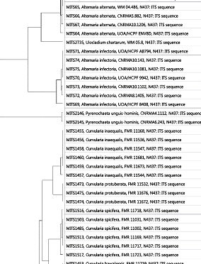 Figure 5 Maximum likelihood phylogenetic tree based on small subunit–internal transcribed spacer–large subunit (SSU-ITS-LSU) rDNA sequence variants of the Alternaria kashmeriana with the closely related sequence matches constructed by phylogeny.lirmm.fr. Branches receiving<70% bootstrap support were collapsed to polynomials, and long branches were shortened by 40%, which is indicated with two diagonal slashes. Bootstrap values are given for branches among but not within cultures. The scale bar indicates the number of substitutions per site with the number '0.5' shows the length of branch that represents an amount genetic change.