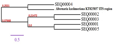 The Phylogenetic tree has documented enough information about the inferred evolutionary relationships among the different allied Alternaria species. The ITS sequence was BLAST using data base to render the species similarities. The maximum likelihood analysis carried out by MOLE BLAST and statistical values of relatedness given by bootstrapping (random sampling with replacement) using another bioinformatics program The bottom line segment with the numeric number '0.5' reflects the length of branch which represents an amount of genetic change. The branch length units (nucleotide substitutions/site) are the number of genetic changes or substitutions divided by the sequence length, Figure 5. A branch length fluctuates proportionally to the nucleotide differences, and the numbers indicated on respective branches reflects the percentages of frequencies with which a given branch appeared in different 100 bootstrap replications.