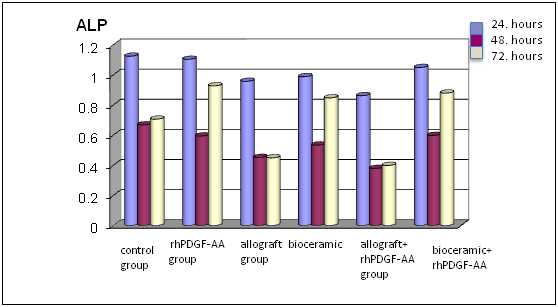 We found the 24h allograft +rhPDGF-AA group was significantly lower compared with control and rhPDGF-AA and Bioceramic +rhPDGF-AA groups (p=0.016, p=0.028). Results show the 24h rhPDGF-AA group was significantly higher compared with allograft group (p=0.016). We found no significant differences among other groups (p> 0.05)(Table 2). We found the 48h control group was significantly higher than Allograft, Bioceramic, Allograft + rhPDGF-AA groups (p=0.048, p=0.009). And, the 48h rhPDGF-AA group was significantly higher compared with both allograft and allograft + rhPDGF-AA groups (p=0.009, p=0.028) (Figure 1). The 48h allograft group was significantly lower than bioceramic and bioceramic + rhPDGF-AA groups (p=0,009). The 72h control group was significantly higher compared with all other groups (p=0,047, p=0,009). The 72h rhPDGF-AA group was significantly higher than allograft and allograft + rhPDGF-AA groups (p=0,009). The 72h allograft group was significantly lower than bioceramic and bioceramic + rhPDGF-AA groups (p=0,009). The 72h allograft + rhPDGF-AA group was significantly lower than bioceramic and bioceramic + rhPDGF-AA groups (p=0,009).