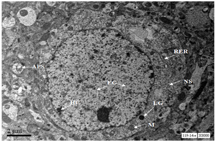 A neuron from the cerebral cortex of 18 months old mouse exhibited abundance of heterochromatin. Cytoplasm was loaded with residual bodies. Mitochondria were swollen. Cytoplasm exhibited poor Nissl granules and RER (Figure 5 & 6).