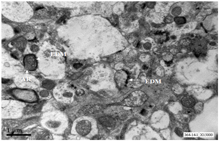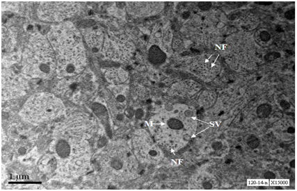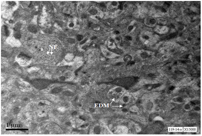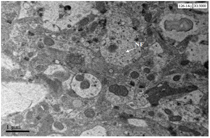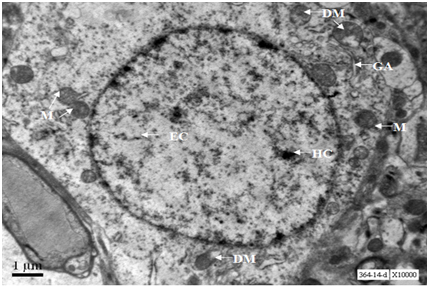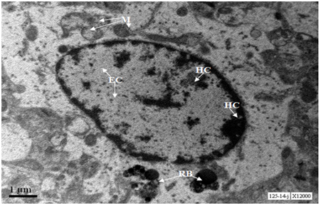 The Ultrastructural details also reveal that the hippocampus is protected than the cerebral cortex. This is evidenced by loss of cytoplasmic contents such as mitochondria, RER, ribonucleoprotein particles in cerebrocortical neuron. Nucleus shows heavily heterochromatinised region, which suggest transcriptional inactivation. A neuron from hippocampus shows nucleus with predominant euchromatin and scanty heterochromatin suggesting the transcriptional activity of the neuron. Cytoplasm is studded with ribonucleoprotein particles, abundance of RER and mitochondria.