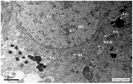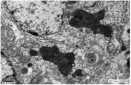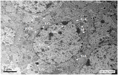 A neuron of the hippocampal region of 18 months old mouse exhibited conspicuous nucleus with marginal traces of heterochromatin and abundant euchromatin. Cytoplasm was fully occupied by Nissl substance and Rough Endoplasmic Reticulum, however Golgi cisternae were not observed in inflated form. The cytoplasm was loaded with lipofuscin granules. Mitochondria were with normal size and shape without any swelling. (Figure 8).