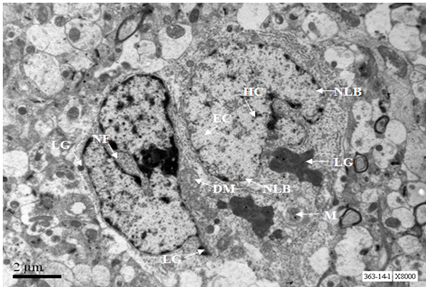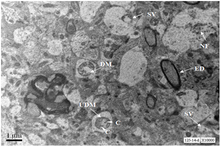 A neuron from Cerebral cortex of 12 months old mouse exhibited conspicuous nucleus with prominent euchromatin. The cytoplasm revealed RER, Nissl substance, mitochondria, autophagosome and few lipofuscin granules (Figure 1).