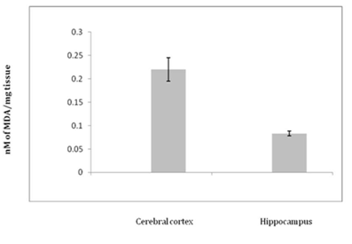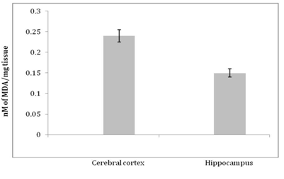 In cerebral cortex of 12 month old mice 0.22 ± 0.025 nM of MDA/mg tissue was observed. While the hippocampal MDA level was 0.083 ± 0.005 nM/mg tissues. In Cerebral cortex of 18 month old mice the MDA levels were 0.23 ± 0.014 nM of MDA/ mg tissue. While in hippocampal region the MDA level was 0.14 ± 0.003 nM/mg tissues. The MDA levels in cerebral cortex of 24 month old mice were 0.24 ± 0.015 nM/mg tissue. In hippocampal region the MDA level was 0.15 ± 0.01 nM/mg tissue (Graph 1-3).