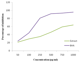 The antioxidant activity was evaluated according to the scavenging activity of stable radical DPPH. The DPPH free radical scavenging activity of methanolic leaf extracts at different concentrations were performed by using method based on the reduction of methanolic solution of colored free radical 2.2 Diphenyl -1-picryl hydrazyl by free radical scavenger.25 BHA was used as the standard antioxidant. 0.1 ml solution of different concentration (50, 100, 250, 500, 750 and 1000 µg/ml respectively) of extract was added to 1.4 ml of DPPH (0.05 mg/ml) and kept in dark for 30 min. The absorbance was measured at 517 nm using spectrophotometer (Shimadzu UV 1800) and the percentage inhibition was calculated by using the following equation.