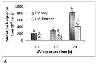 Ultraviolet (UV) induced mutagenesis: Overnight grown E. coli MG1655 was subcultured in Luria-Bertini medium (25 ml, 1:50 dilution) and grown at 37°C for 3 h at 125 rpm in an orbital shaker. The cells were centrifuged (8000g for 10 min) and pellet was resuspended in sterile MgSO4 (0.2 M). An aliquot (50 µl) of cell suspension was exposed to UV (254 nm; lamp power, 8W; Intensity, 220 μW/cm2) for 10, 15 and 20 s, in presence and absence of the date palm aqueous extract. It was then inoculated in 1 ml LB in 3 replicates for overnight at 37°C. The culture was serially diluted using sterile saline (0.85%) and spread plated on LB-agar-rifampicin (100 µg/ml) plates (for scoring RifR mutants) and on LB-agar plates (for enumerating viable cells) and incubated at 37°C for 24 h. Mutation frequency was determined by calculating the ratio of the total number of RifR cells per ml to the total number of viable cells per ml.