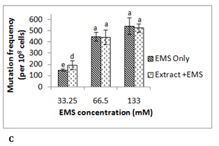 EMS induced mutagenesis: LB-grown mid-log phase cells (1ml) were centrifuged at 8000 g for 10 min and the pellet was resuspended in LB medium. Antimutagenic assay was performed by incubating cell suspension with EMS (33.25, 66.5 and 133 mM), in the presence as well as absence of the fruit extract and incubating at 37°C for 45 min at 125 rpm. The cells were centrifuged and pellet was washed twice with LB and resuspended in 1 ml of the same. An aliquot (50 µl) of the cell suspension was inoculated in LB broth (1 ml), grown overnight at 37°C on a rotary shaker (125 rpm) and its proper dilutions were spread plated and mutation frequency was calculated as described above.