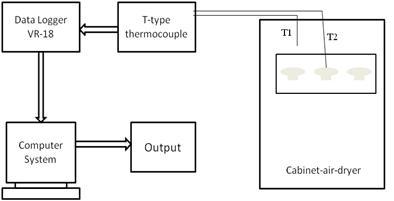 Freshly harvested white button mushrooms were purchased from the local greengrocers. They were sorted manually based on shape, size and color before processing. Dimensionally similar mushroom were selected for the experiments. The dimension of these mushrooms was calculated using vernier calipers (Forbes) with an accuracy of 0.02 mm. All the mushrooms were washed thoroughly to remove soil impurities. Two mushrooms viz. sample 1 (S1) and sample 2 (S2) of approximately same dimensions and weight were chosen. The selected samples were then placed in a cabinet‒air‒dryer (Industrial & laboratory tools corporation, Chennai Serial No. S1016), dried at a temperature of 54±1°C. Mushroom S1 was analyzed for moisture content, S2 for temperature profile. Figure 1 shows the schematic arrangement of the experimental setup.