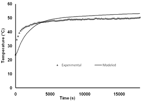 The simulation predictions were compared with the experimental measurements of temperatures for mushroom drying process. The simulation results were in good agreement with the experimental results as shown in Figure 3. Initially, there is a high temperature gradient (∆T) between the mushroom and air temperature due to which the rate of heat transfer to the mushroom is very high. As a result, steep rise in temperature of mushroom was observed initially, followed by steady state condition after 6600s temperature. The difference in experimental and modeled temperature profile can be attributed to the combined effects of experimental and model assumptions viz., shrinkage is negligible, isotropic condition and thermal properties of materials.