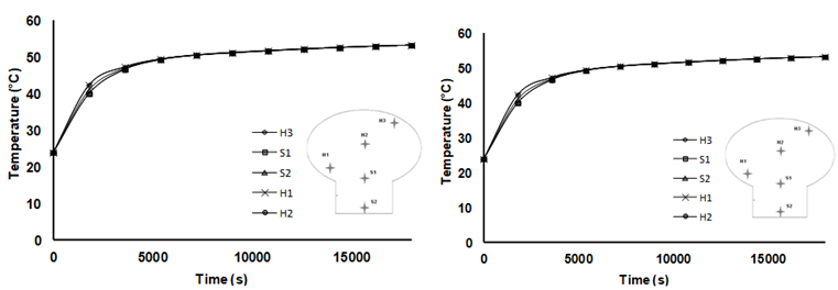 The variation of moisture content of mushroom at 5 different points is depicted in Figure 7. From the Figure 7, it can be observed that the rate of drying is minimum at H2 and maximum at H3 as the transfer of moisture from the stem is faster than that of the head portion as mentioned earlier in the case of temperature. Also, it is found that the drying rate is almost the same for points H1 and H3 due to its proximity to the boundary surface. The drying rate is similar for S1 and H2 since S1 is located at the interface of the head and the stem. Thus, it can be concluded that diffusion controls the rate of drying and therefore is the rate limiting step. Since the model has already been validated with case A (Twall=55°C), it can be used to make predictions for drying at different temperatures. In this view, the following two case studies were performed with the same boundary conditions except for wall boundary condition as given below;