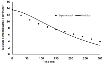 Balaban8 compared the effect of incorporation of shrinkage in food materials during drying and concluded that non consideration of shrinkage in simultaneous heat and mass transfer models can cause significant differences between the actual values of temperature and the results as predicted by the model. The same could be seen in this model. However, it was observed that as the time progresses the experimental temperature slowly approaches the modeled temperature thereby reducing the difference in modeled and experimental values. Ranjan et al.14 predicted drying behavior of banana by varying drying air temperature using finite element model without considering shrinkage effects, which resulted in good agreement with the experimental results.