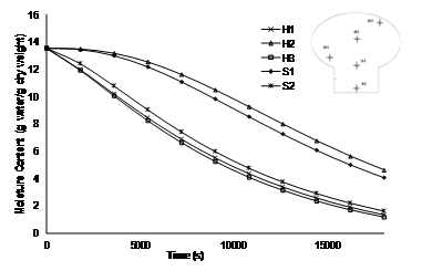 Figure 4 shows the variation of temperature with respect to time along five different points (as depicted points in Figure). It can be seen that the rise in temperature along all these points is almost the same. The temperature at points S1 and S2 are located in the stem of the mushroom and rises steeply. Heat transfer is inversely proportional to the surface area and the surface area of the head is more than that of the stem. Therefore, transfer of heat to the stem took place at a much faster rate than the mushroom head portion. This observation was same as reported earlier by Senadeera et al.15 that as the surface area increases, drying rate decreased at every drying temperature. The points H1 and H3 also show a steep rise due to their proximity to the boundary surface of the mushroom. However, H2 located at the centre of mushroom shows a gradual increase in temperature.
