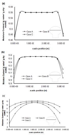 To study the variation of moisture within the mushroom along the radial as well as the axial direction, Moisture profiles were plotted for all the three cases (case A, case B and case C) with 3 different time steps.